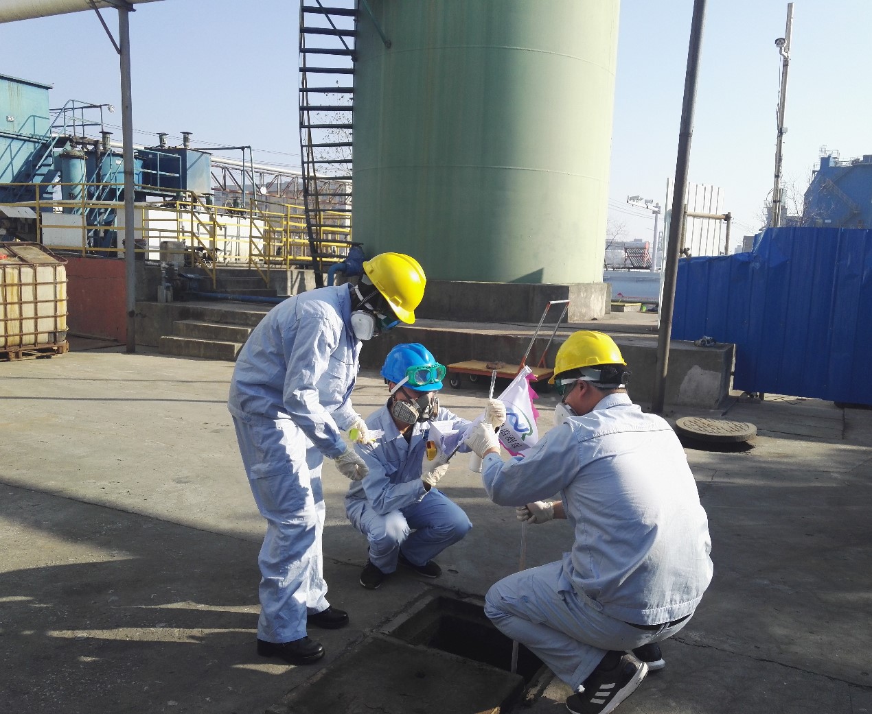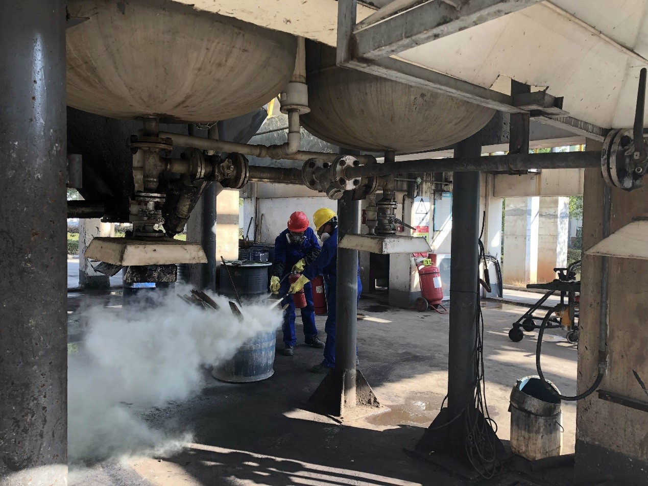 叉車卸料到1號釜旁,噸桶跌落,意外破裂,發(fā)生泄漏,人員按照《泄漏處理操作規(guī)程》實施堵漏作業(yè)。