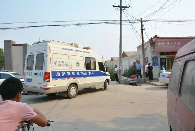 石家莊市環(huán)保局的應(yīng)急監(jiān)測(cè)車開(kāi)進(jìn)事發(fā)現(xiàn)場(chǎng)。